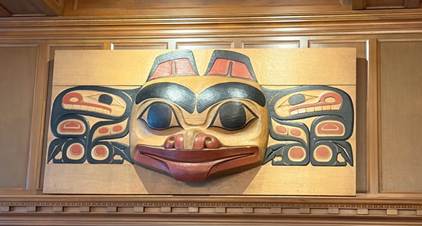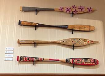 Further inside, the group admired an array of intricately painted canoe paddles displayed along the hallway wall. These paddles represent recipients of the BC Reconciliation Award, an initiative launched by former Lieutenant Governor the Honourable Steven Point. The paddles symbolize a shared vision of unity expressed through his saying, “If we are all in the same canoe, we must paddle together.” New paddles have been added each year since the program began in 2021.